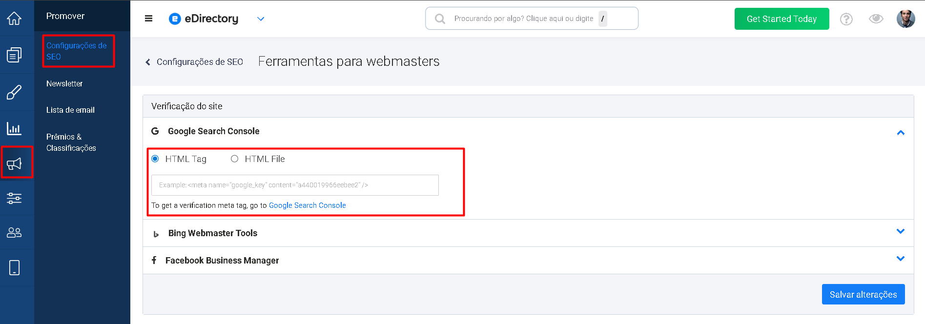 O eDirectory oferece uma Ferramenta de Verificação integrada que permite adicionar meta tags de verificação sem precisar editar manualmente o código-fonte do site.