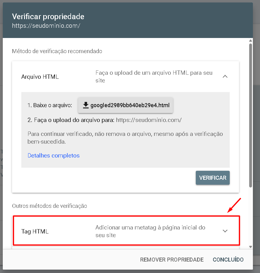 - Recomenda-se manter a tag de verificação enquanto você desejar preservar a comprovação de propriedade.