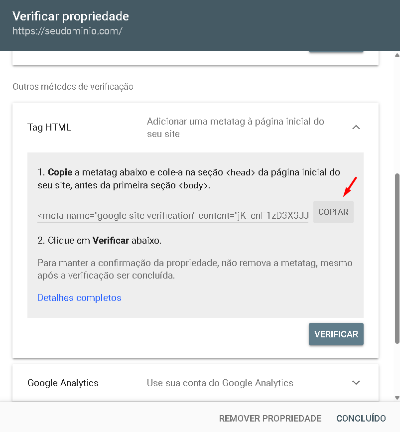 - Copie a meta tag fornecida pelo Google