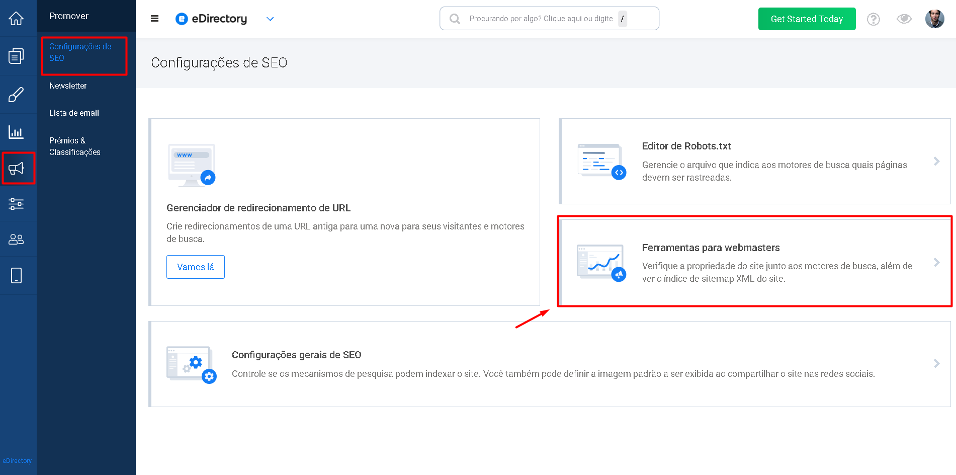 - Vá para Promover → Configurações de SEO → Ferramentas para Webmasters