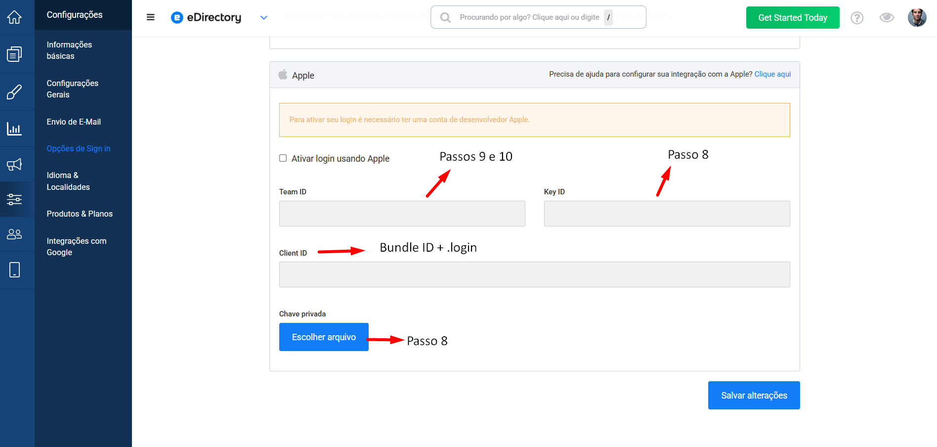 Seguindo esses passos detalhados, você configurou com sucesso o Login com Apple para sua aplicação. Isso proporcionará aos seus usuários uma maneira segura e conveniente de se autenticar usando seus IDs Apple, melhorando sua experiência geral. Lembre-se de manter seu arquivo de chave privada seguro e consulte este guia se precisar rever as configurações de configuração. Se você encontrar alguma dúvida ou precisar de mais assistência durante este processo, não hesite em contatar nossa equipe de suporte em support@edirectory.com.