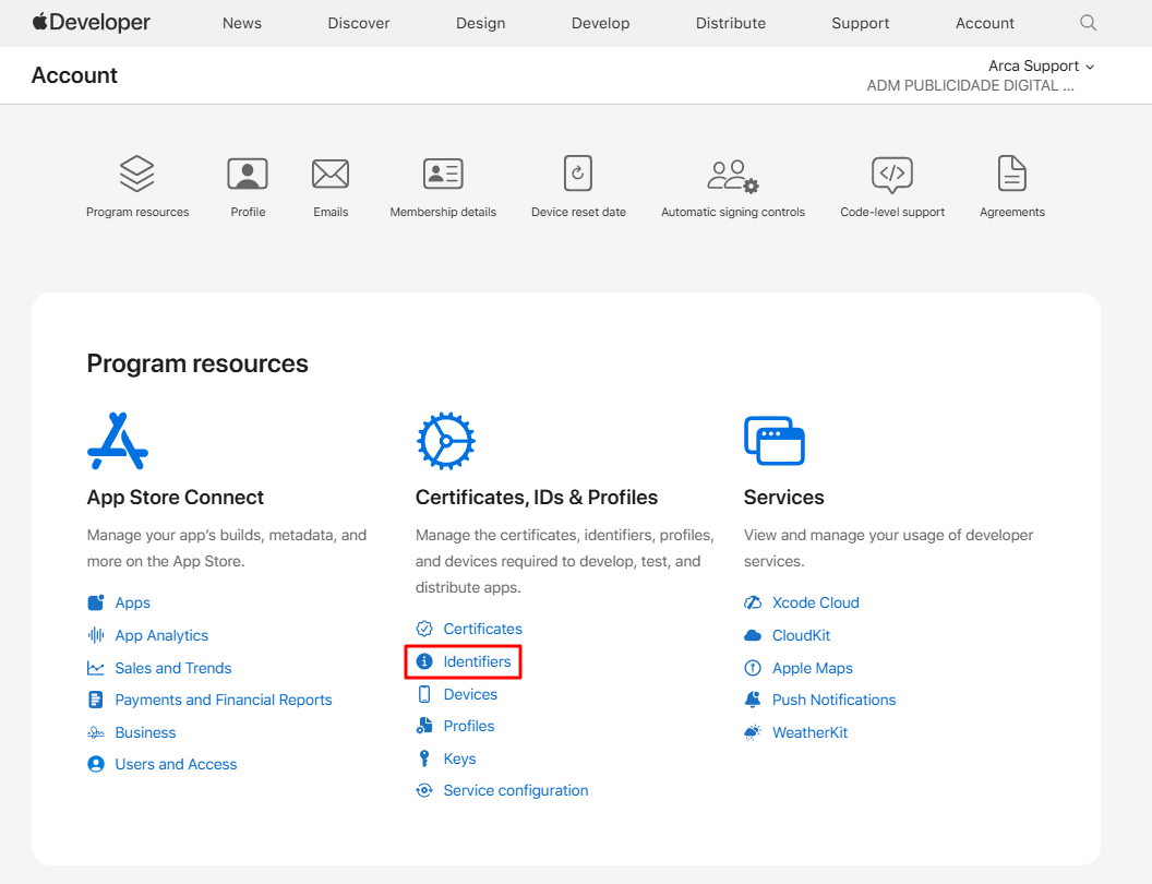 - Navegue até Identificadores: Vá para sua conta de Desenvolvedor Apple e clique em "Identificadores." Em seguida, clique no botão "+" (Adicionar).