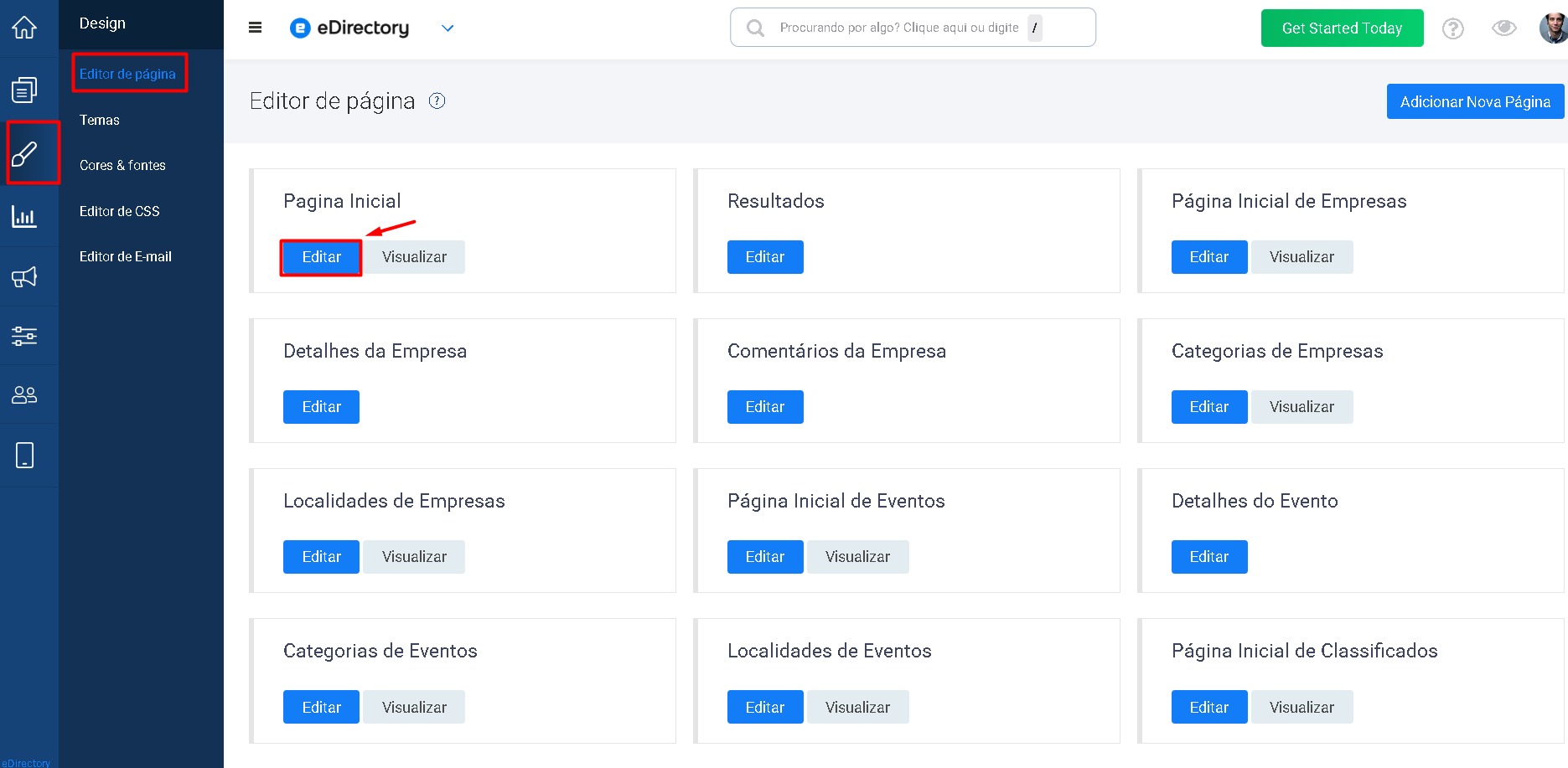 - Vá até Design → Editor de Páginas na sua área administrativa.