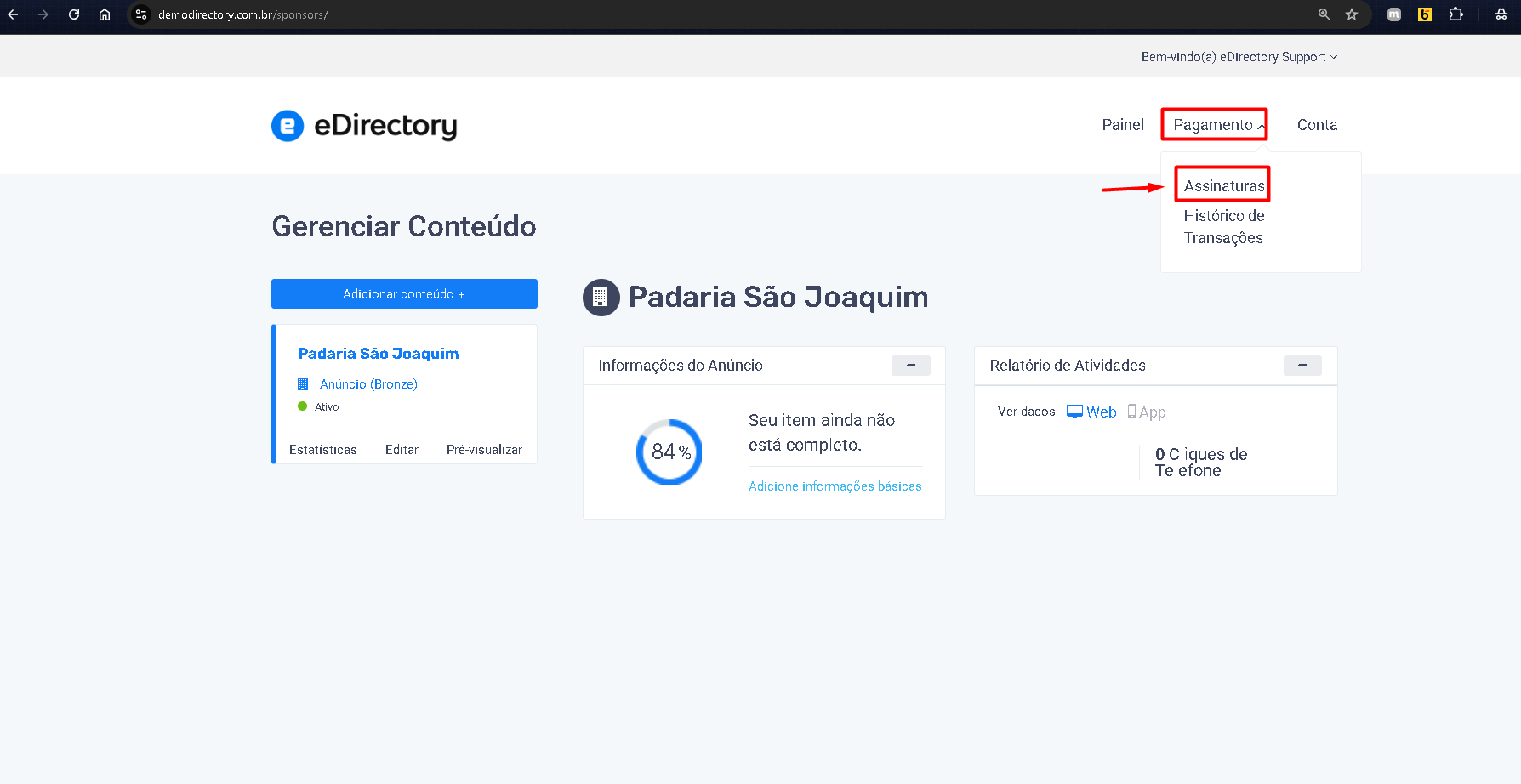 - Depois de concluir a assinatura do novo plano, o cliente pode confirmar se o upgrade foi feito com sucesso acessando: Pagamento > Assinaturas.