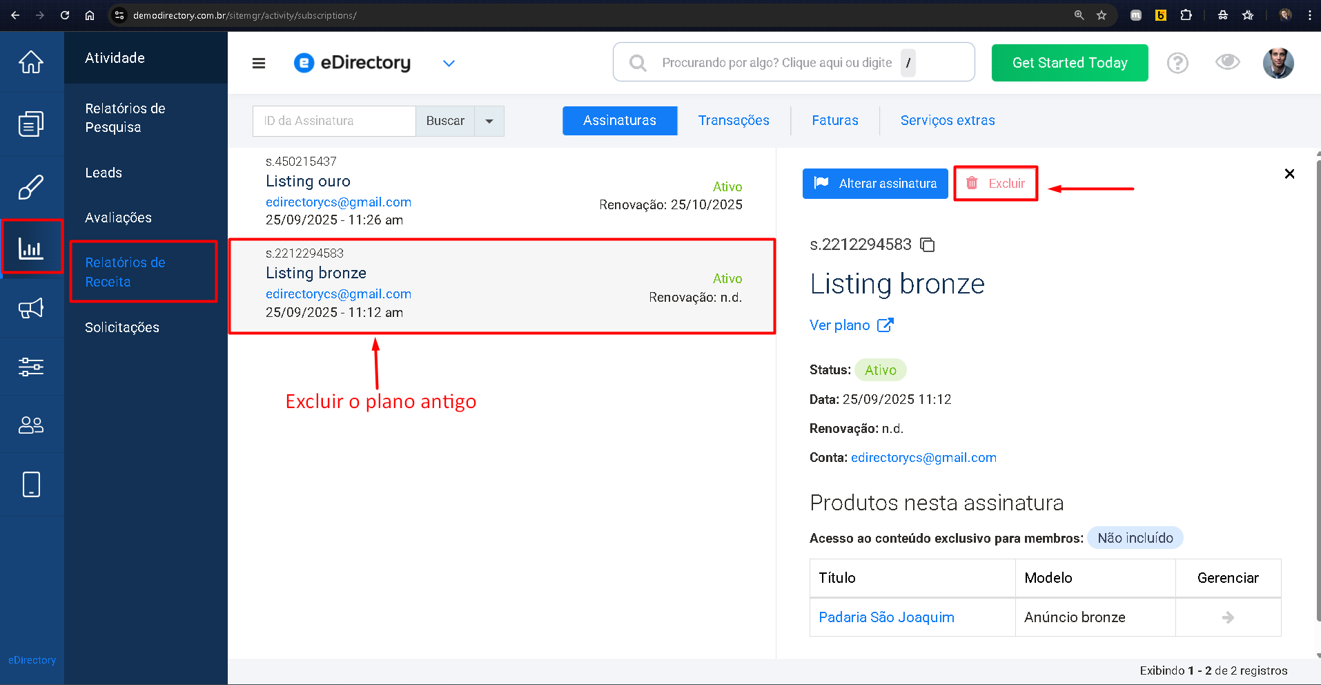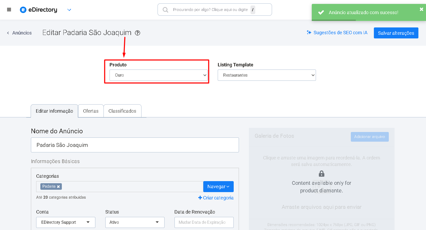 - Agora é necessário mudar o Produto para o tipo de Produto que o novo plano disponibiliza. Por exemplo, no plano grátis deste exemplo, o usuário tinha direito ao anúncio bronze, mas no plano Ouro, ele tem direito ao anúncio Ouro.