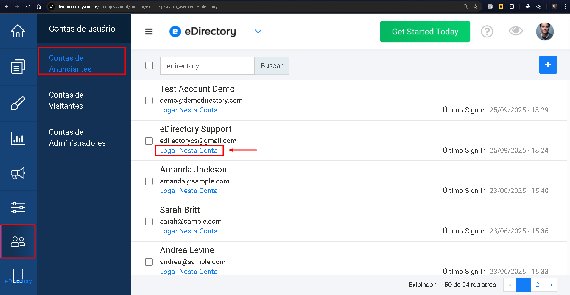 - O administrador deve então acessar: Contas de usuários > Contas de Anunciantes, localizar o cliente em questão e entrar na conta.