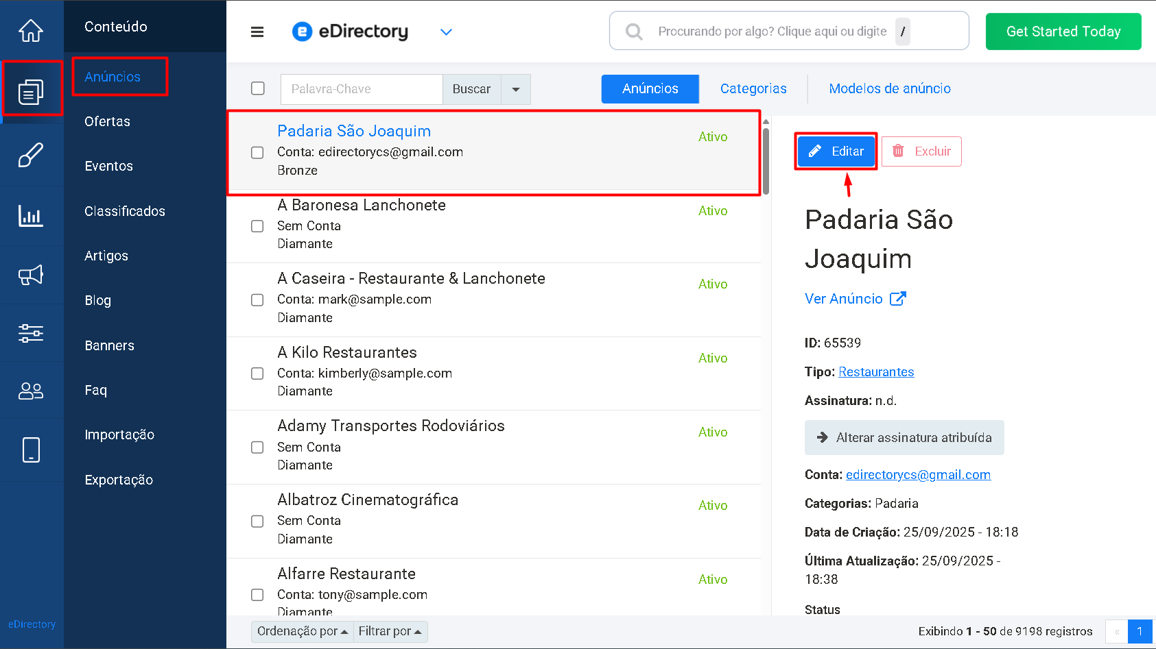 - Acesse Conteúdo > Anúncios na área administrativa e clique para editar o anúncio do cliente em questão.