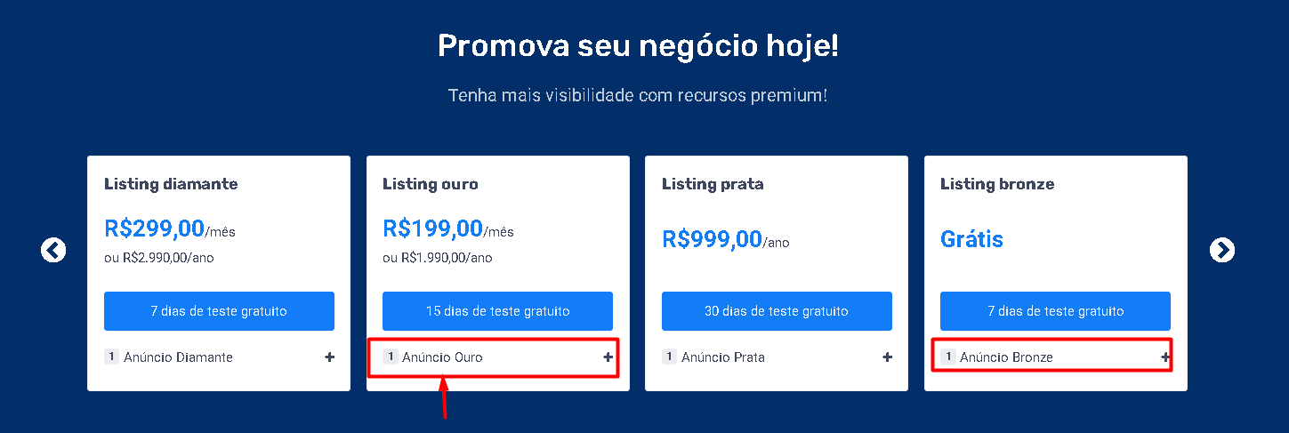 - O primeiro passo é o cliente acessar a página “Anuncie conosco”, onde estão listados todos os planos disponíveis, e selecionar o plano pago de sua preferência. Neste caso, selecionamos o Plano Ouro