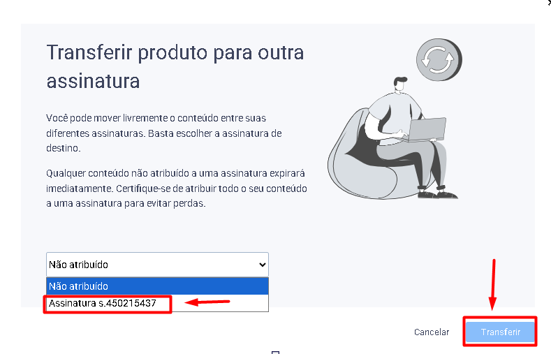 - Na parte superior direita da tela, haverá a opção “Gerenciar assinatura”. O administrador deve clicar nela e vincular cada conteúdo à nova assinatura paga.