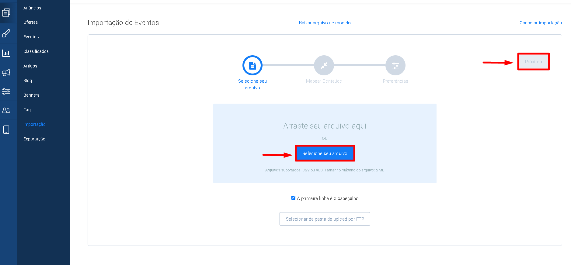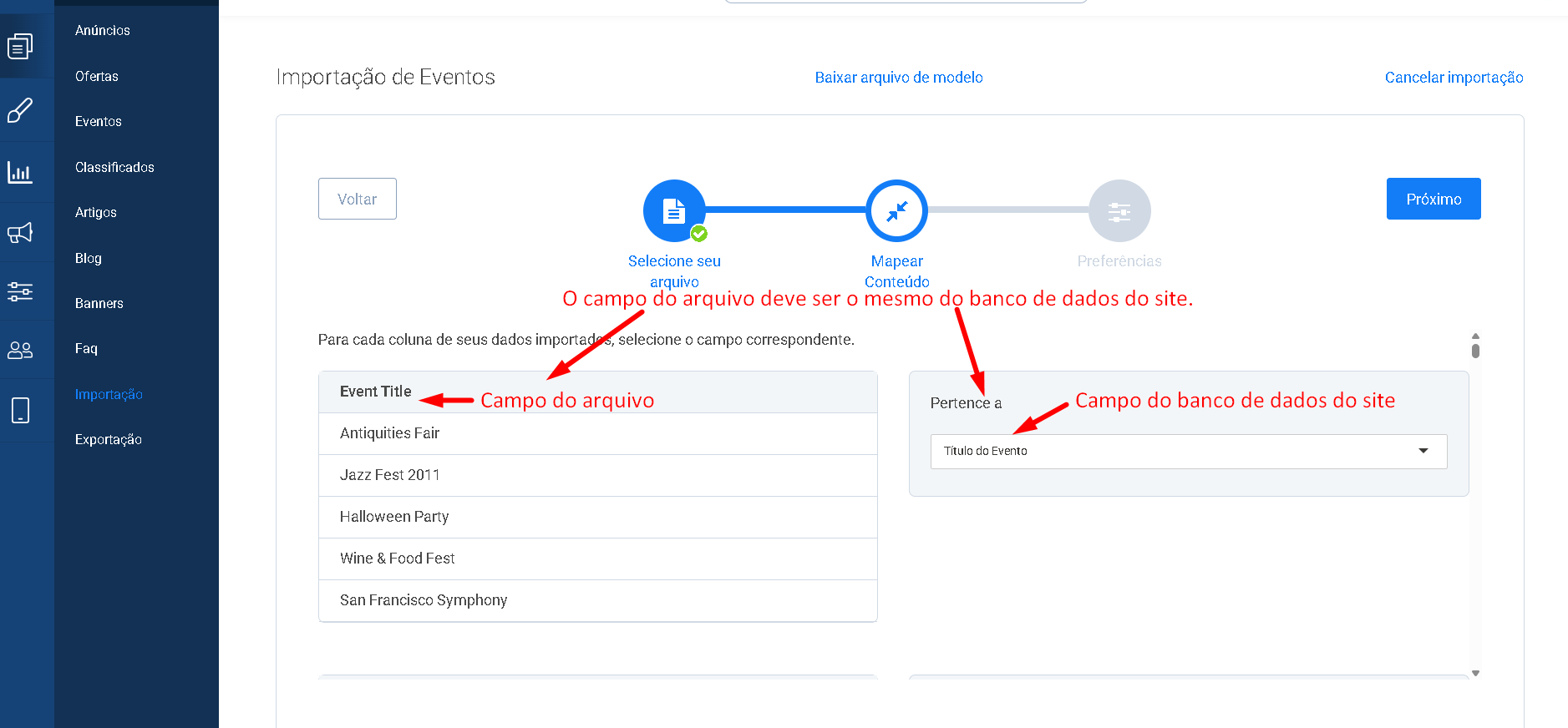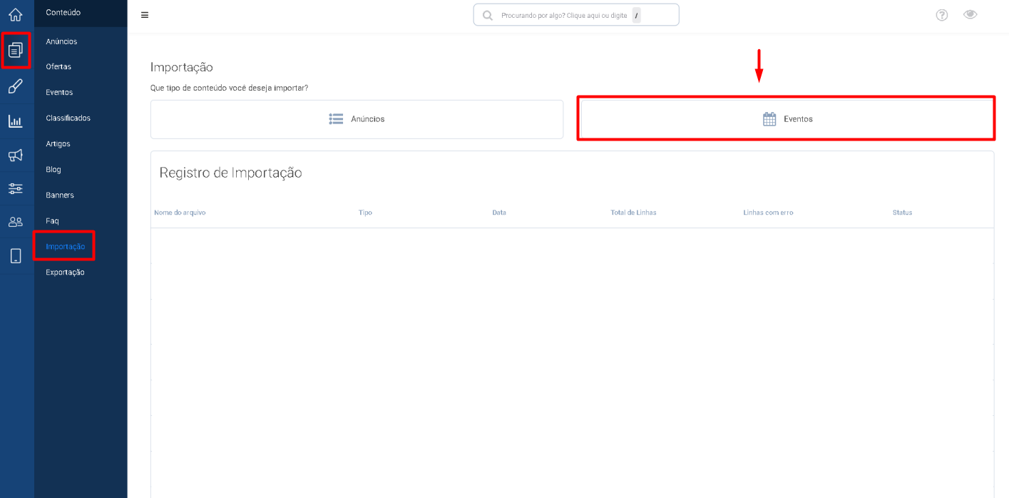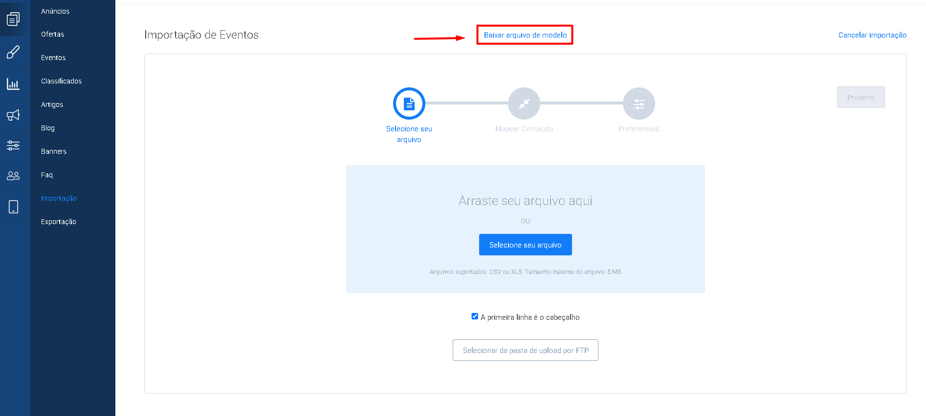 - Acesse Conteúdo > Importação > Eventos > Baixar Arquivo Modelo.