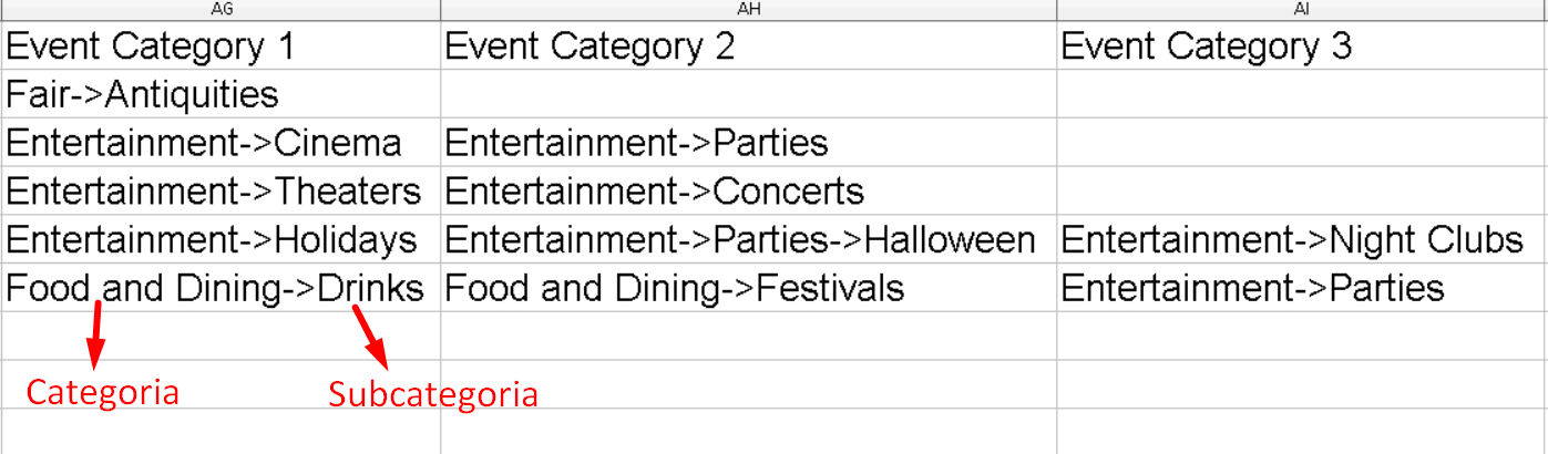 - Formate as subcategorias como Categoria->Subcategoria (exemplo: Hotéis->Hotéis de Luxo).