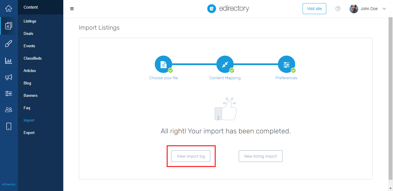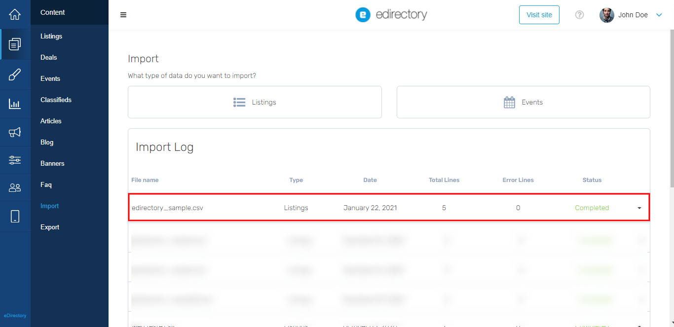 - Importação travada na fila: se o processo demorar mais de 1 hora, entre em contato com o suporte pelo e-mail support@edirectory.com.