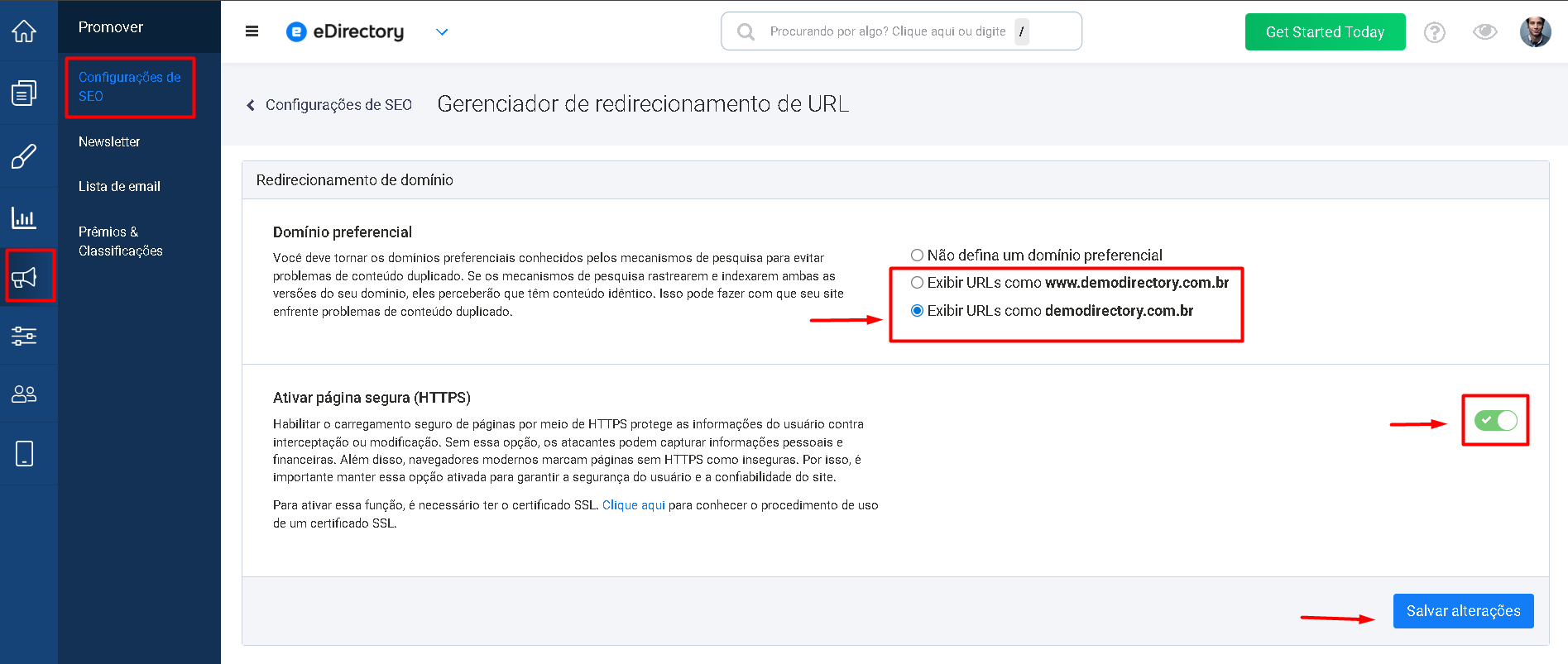☐ O domínio preferido está configurado em: Promover → Configurações de SEO→ Gerenciador de redirecionamento de URL